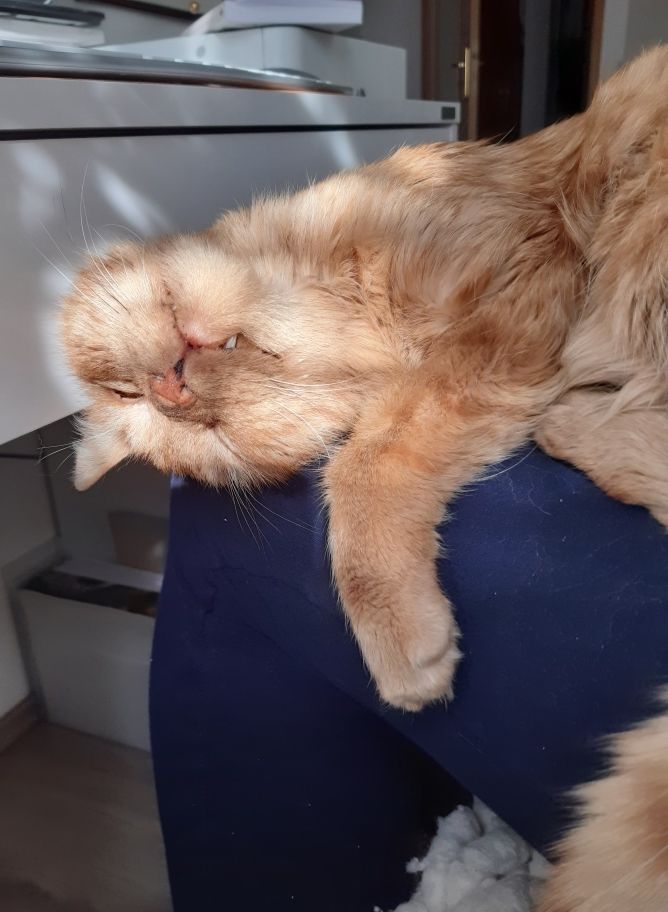 (Noch ziemlich bedröppelt von der Narkose ist Pedro mittendrin einfach eingeschlafen. Rückzug ins Sideboard.)